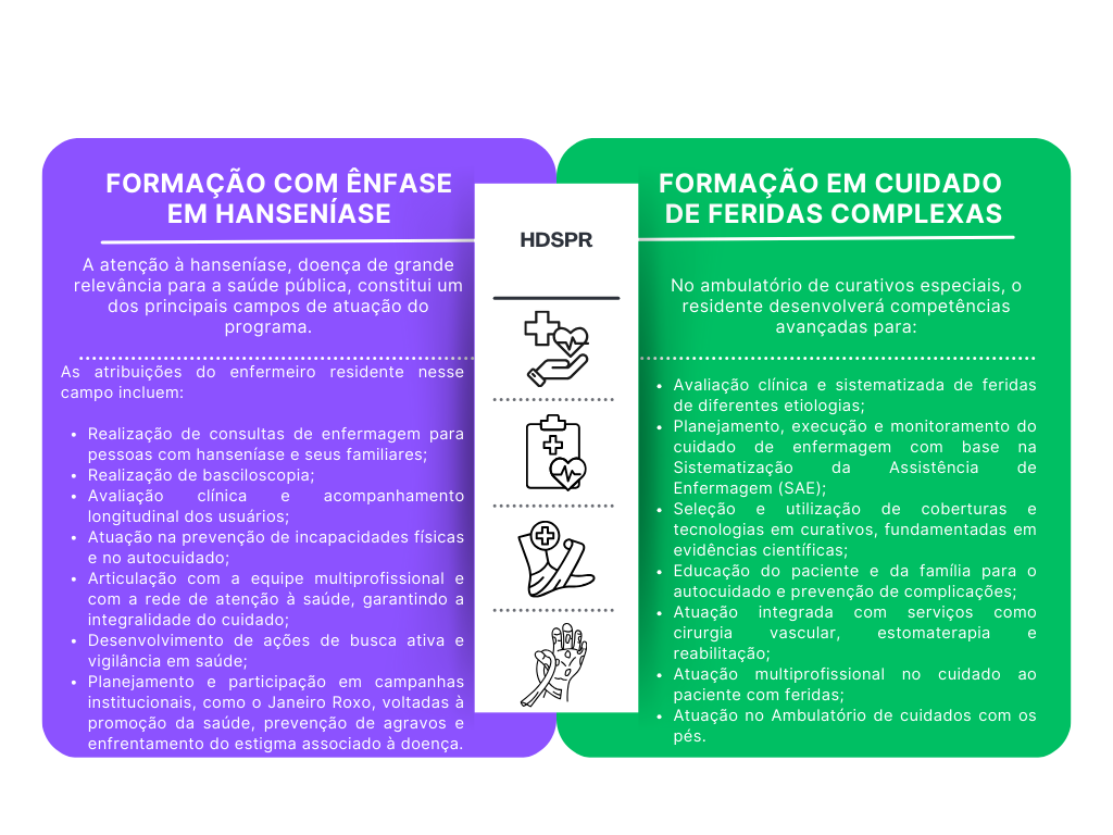 As atividades do programa de residência em enfermagem se desenvolvem pautadas nas atribuições legais e éticas da categoria profissional, conforme as normativas do Conselho Federal de Enfermagem (COFEN) e o Código de Ética dos Profissionais de Enfermagem. A formação ocorre em cenários reais de prática do HDSPR, com foco em atendimentos individuais, prestação de assistência qualificada no nível da atenção especializada e integração permanente com a equipe multiprofissional e com a Rede de Atenção à Saúde.